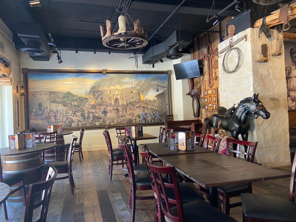Before we would visit the collections, it was time for lunch (have to keep the kids happy and fed, and take a break from the Texas heat). Luckily right across the street from the Alamo is Crockett Tavern. Getting there before noon, we beat the lunchtime rush. The food was great, and the atmosphere was the perfect Texas/ Alamo vibe. (Crocket Tavern).