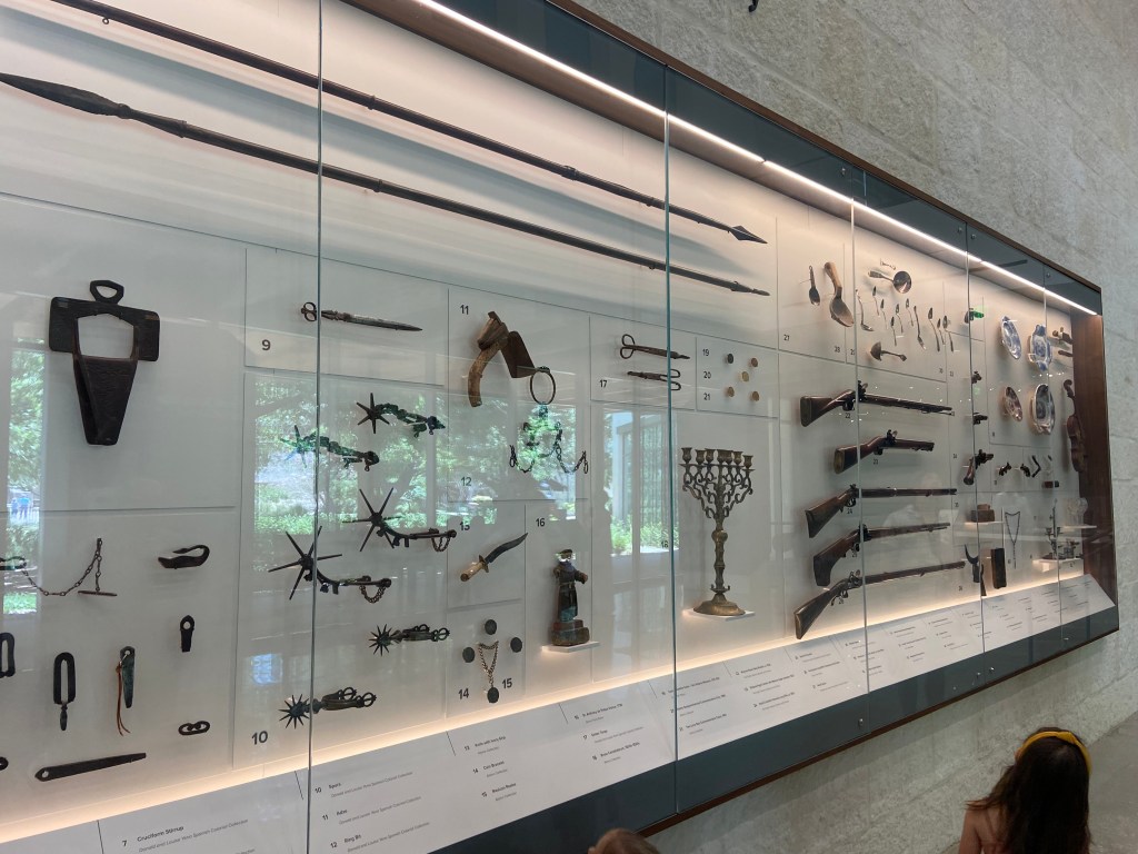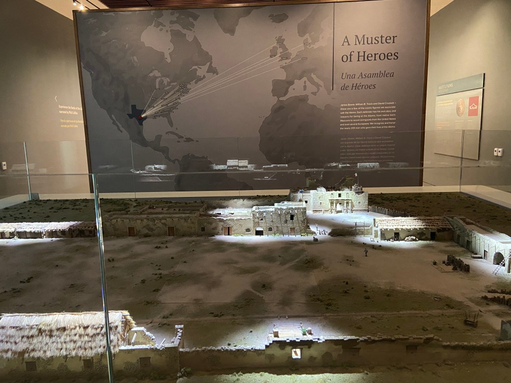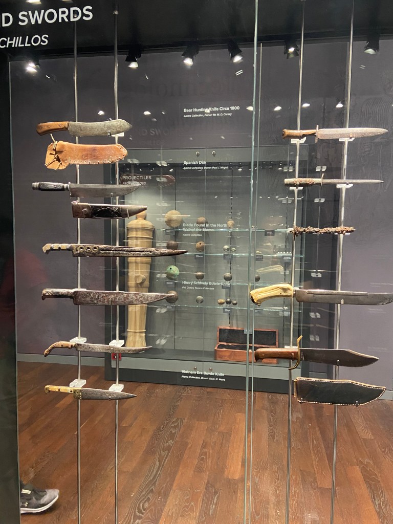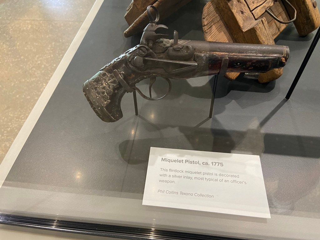 After the kids were fed we headed back to the Alamo complex to visit the collections at the Alamo Exhibit in the Ralston Family Collections Center. The collections did not disappoint for the $12/ adult tickets. Our kids were young enough to be free. The exhibit displayed weapons and artifacts with strong ties to the Texas Revolution and the Alamo. Before I visited Texas, I never knew the connection between Phil Collins and the Alamo. Long story short, Collins developed a strong liking to the Alamo story and collected many artifacts. Later, he donated these artifacts back to the Alamo. Therefore, many of the artifacts in the collections are part of the Phil Collins collection. There is also an impressive diorama of the Alamo complex as it appeared in 1836, with Phil Collins narrating events of the battle.