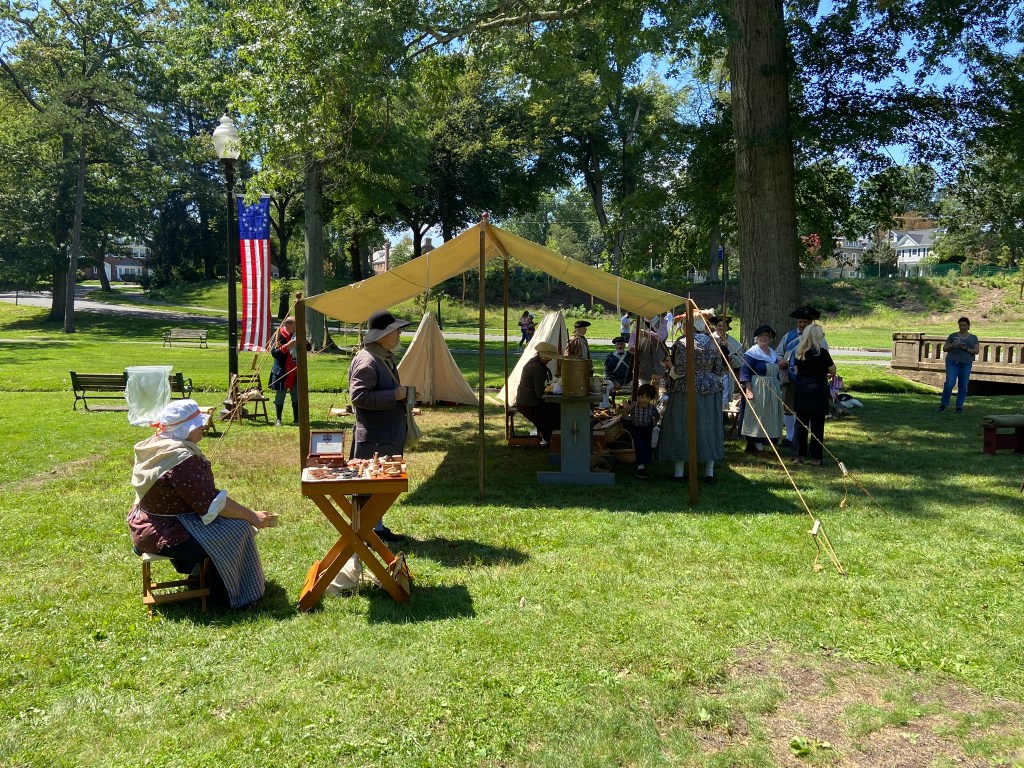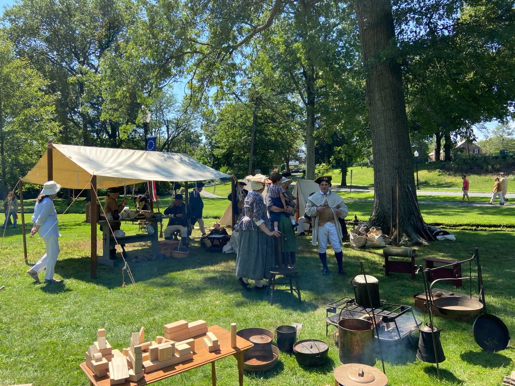 Following the opening ceremonies, the crowd marched into the center of Mindowskin Park, led by Washington and Rochambeau. The park took on the form of a Revolutionary Era militia encampment with colonial games, cooking demonstrations, and frequent marches, drills and musket firing from the soldiers.