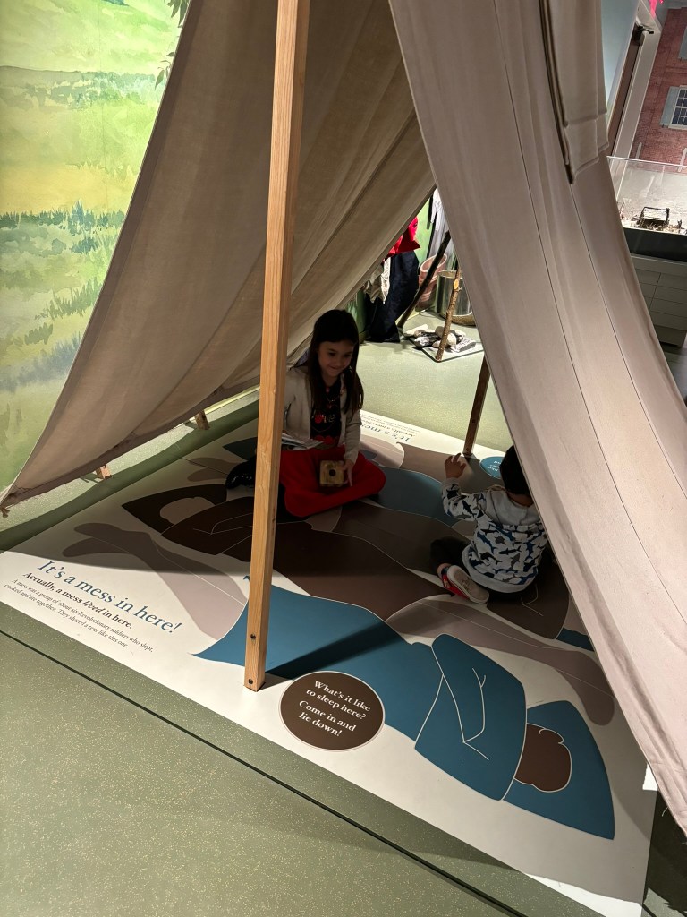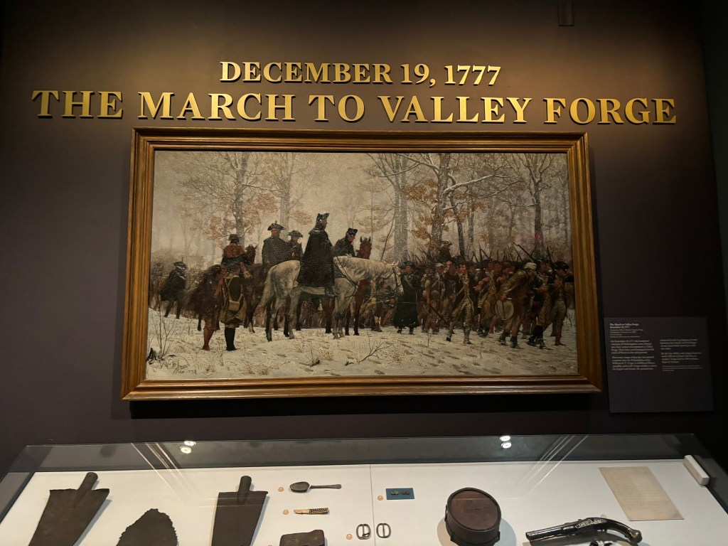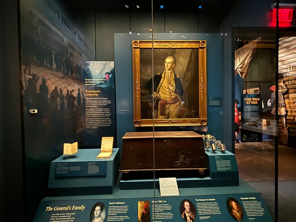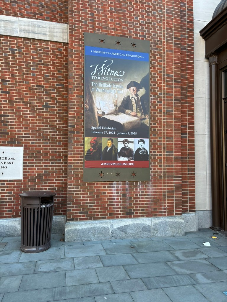 Our first stop when we arrived in Phili was the Museum of the American Revolution, which was my first visit there. The special exhibit that opened the day before we arrived is “Witness to History: The Unlikely Travels of Washington’s Tent.” In my blog post from July 2023, (visit here) my family and I visited Morristown, NJ to see a replica of Washington’s War Tent, and explore inside. The real, authentic tent is located at the Museum of the American Revolution, and we were able to see it there (the museum did not allow photographs of the tent, but photos can be found here.) The new exhibit highlights the roughly 250 year journey of Washington’s War Tent as it has passed through the generations and miraculously has survived through not-so-delicate hands to make it to the museum in Philadelphia. The tent highlights Washington’s commitment to be among his troops and live in similar conditions as them. Washington was a leader that his troops could relate to and respect. He did not want to appear as an elitist or authoritarian. His living quarters were far different from what other European leaders, such as Napoleon, were living in while on campaign. Before viewing the real tent, you are shown a short video about the Revolution and the journey of the tent through the ages. The survival of the tent represents the survival of our fragile, delicate and at-times challenged republic.