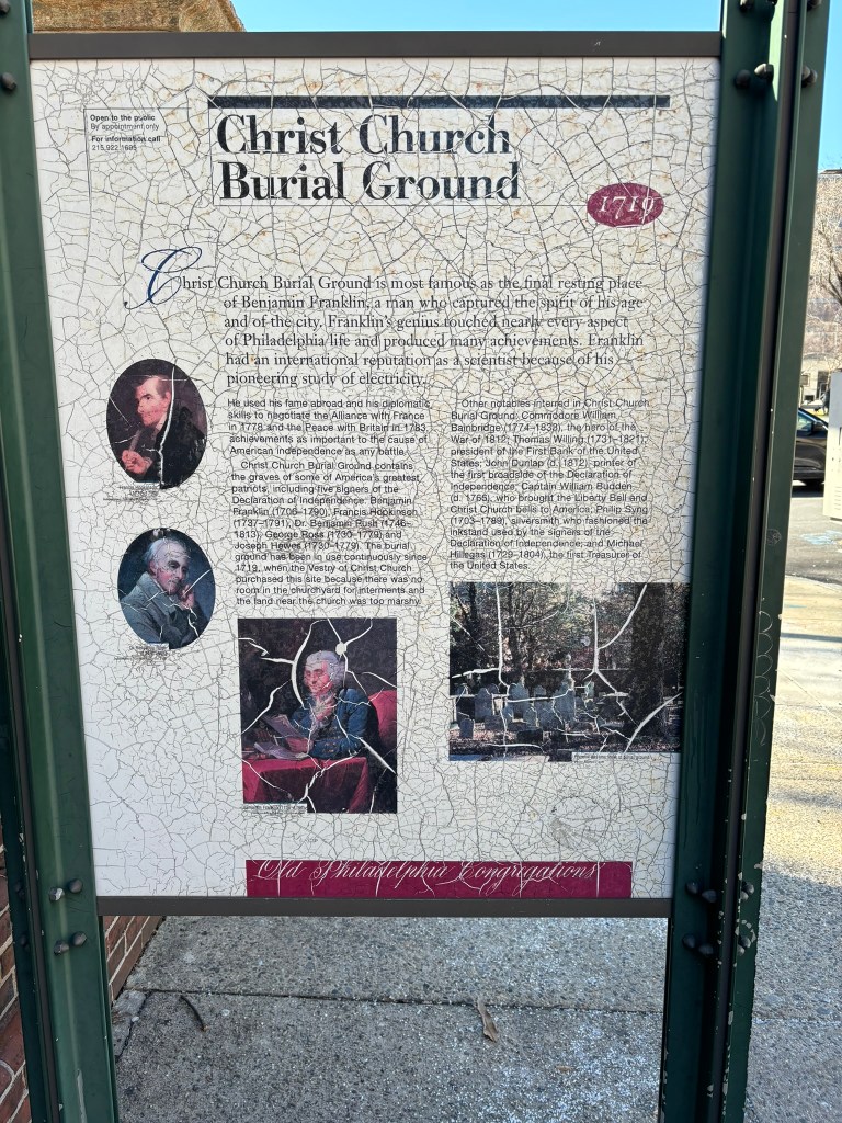 My family and I took a trip to Philadelphia for Presidents’ Day weekend. Day One was seeing historic sites and museums, and Day Two was going to the Please Touch Museum for the kids. This blog will focus on our visit to the Museum of the American Revolution, The Christ Church Burial Ground with the grave of Ben Franklin, The National Constitution Center, Independence Hall and Congress Hall.