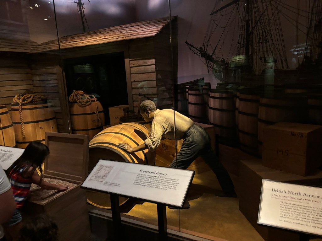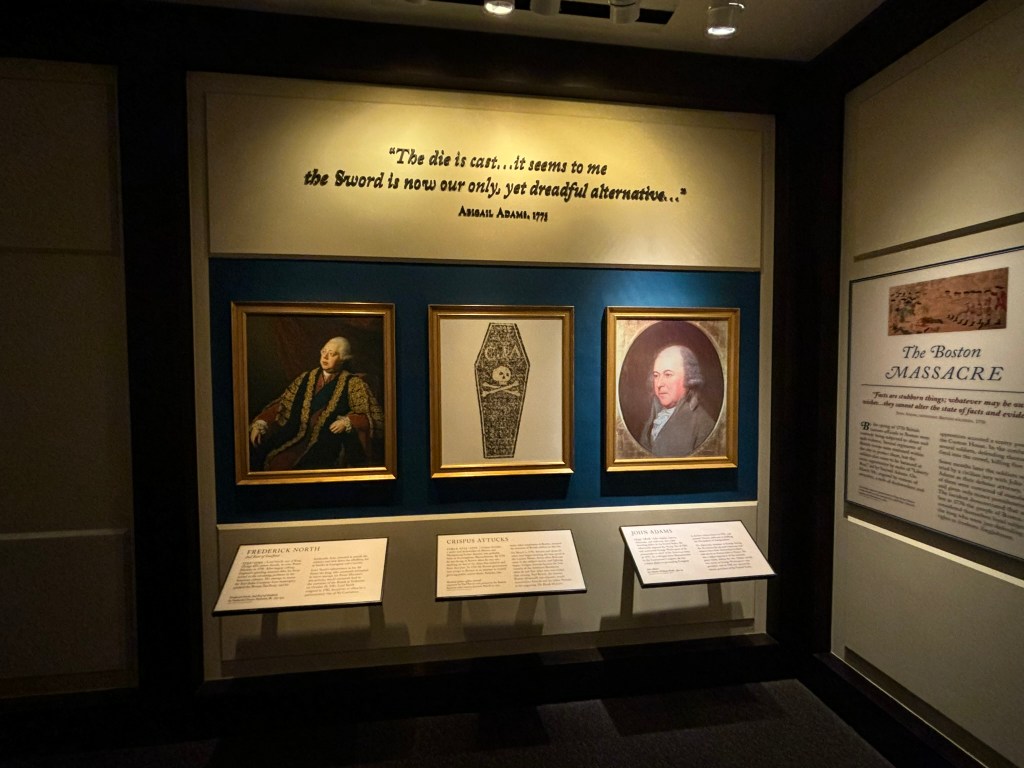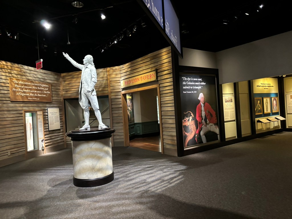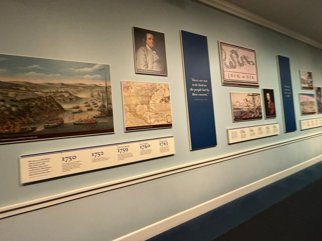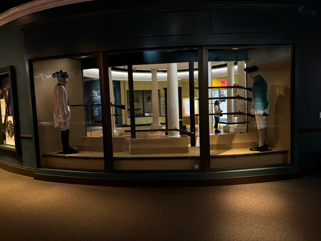 At this point in our tour, we had time to travel through the museum at our own pace. The museum takes you through the American Revolution chronologically, from the causes in the beginning of the museum, to the writing of the Constitution at the end. They had a great array of different types of displays including artifacts, primary sources, videos, and pictures that allowed the viewer to be immersed in the conflict.
