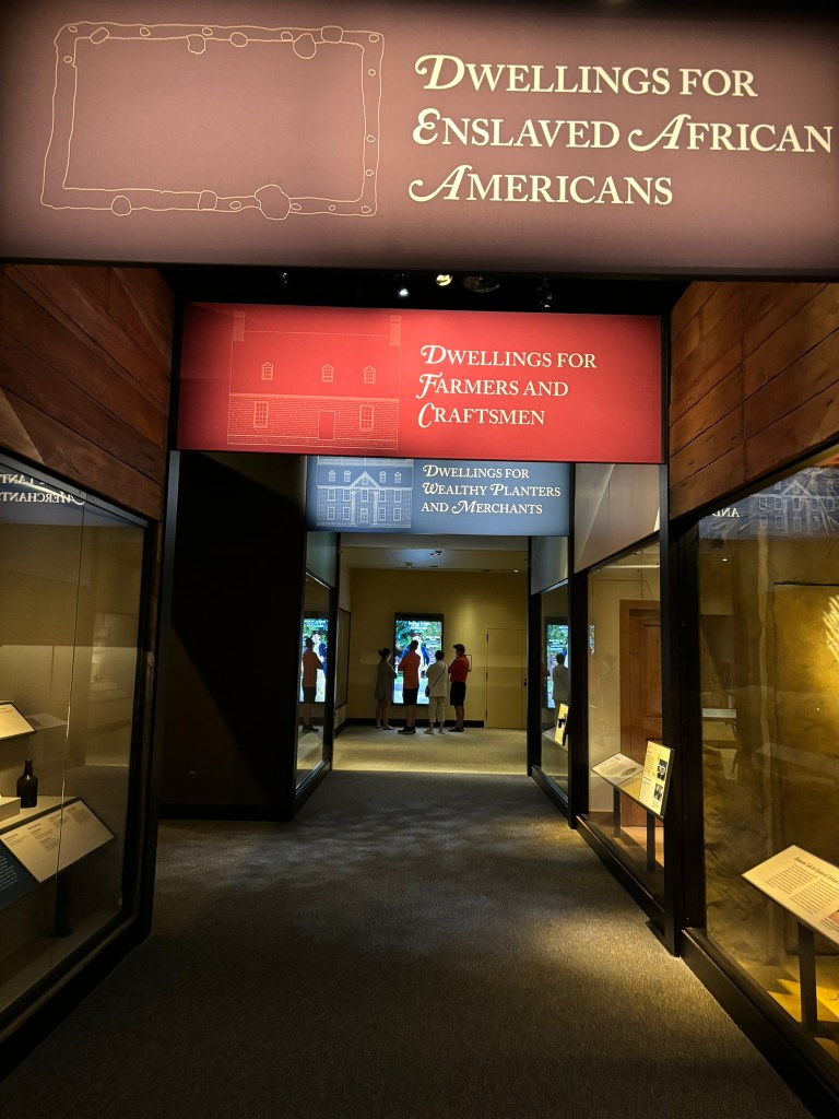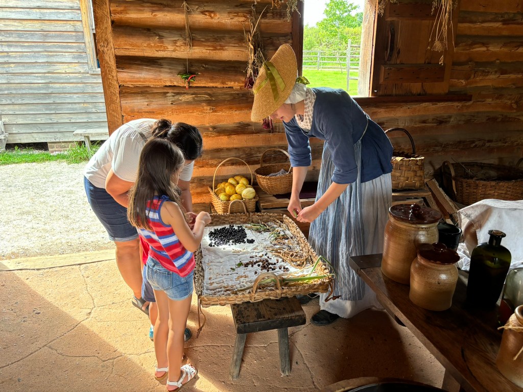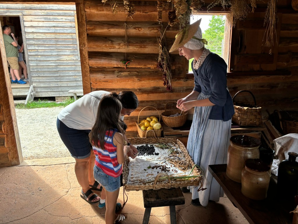 We then moved onto a living-history farm, as well as other structures. We went to a detached kitchen where my daughter separated peas from a pea pod, and we were taught how the colonials preserved food. We also moved onto a structure that would serve as a living quarters for a middle-class family. To supplement the family income, they weaved clothing from yarn using a loom. My family and I then made our way back to the museum to meet our group and catch the bus back to Williamsburg.