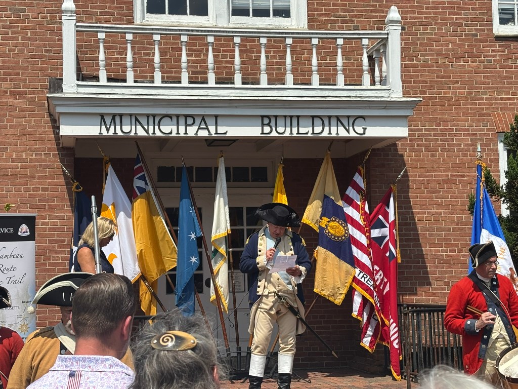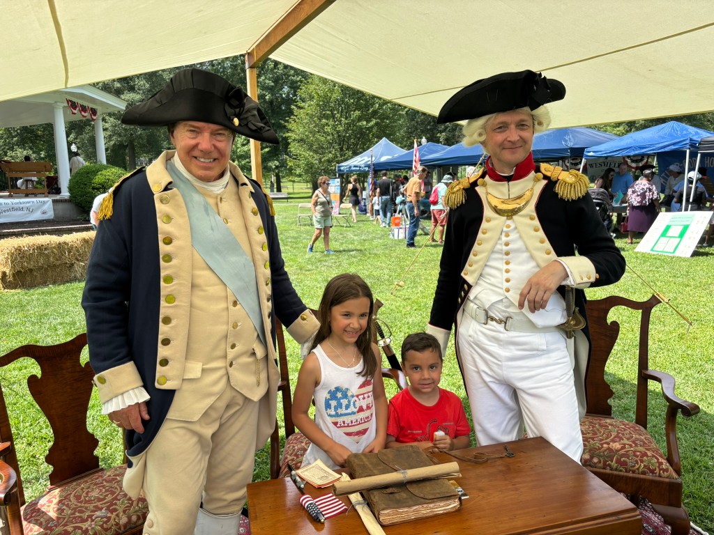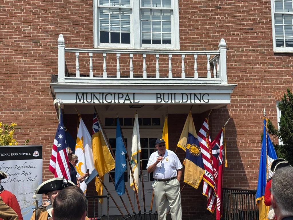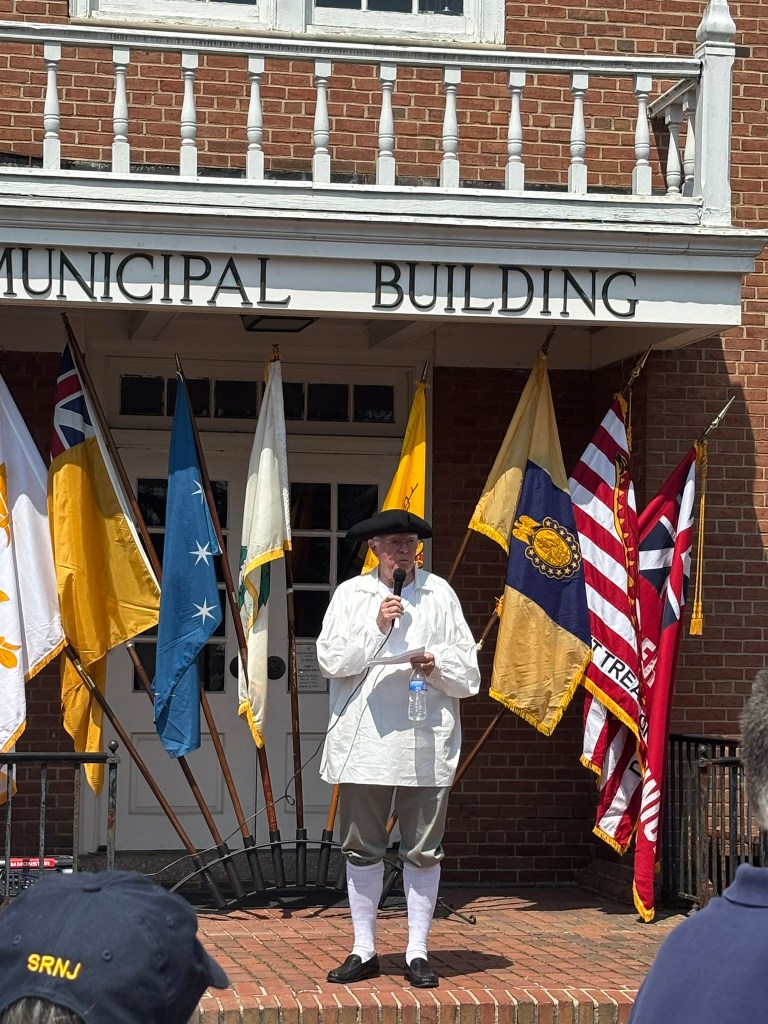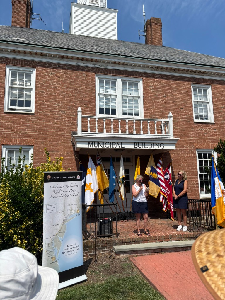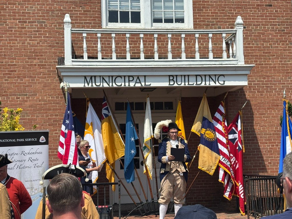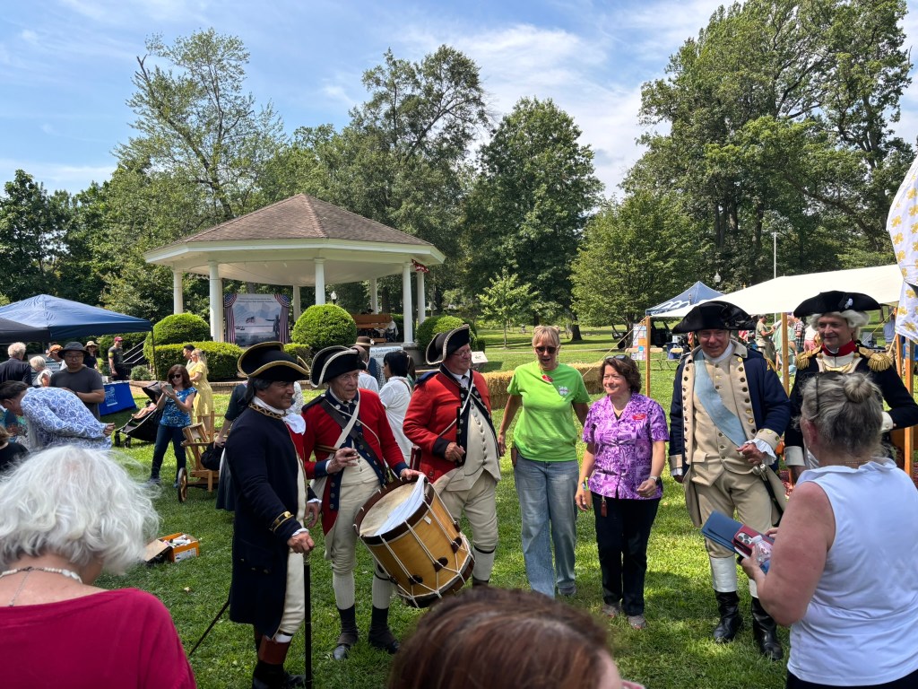 The program began at noon with an opening ceremony in front of Westfield Town Hall on East Broad Street. The first remarks, by Julie Diddel, chair of W3R-NJ, highlighted the significance of the Washington-Rochambeau Revolutionary Trail and Westfield’s role in the Revolution. She was followed by other speakers, including Westfield Mayor Shelley Brindle and leaders from local historical organizations. General George Washington, portrayed by reenactor Sam Davis, offered an opening prayer, and the New Jersey Fifes and Drums led the crowd in the Star-Spangled Banner.