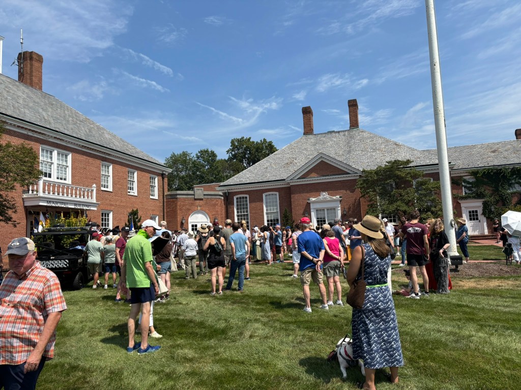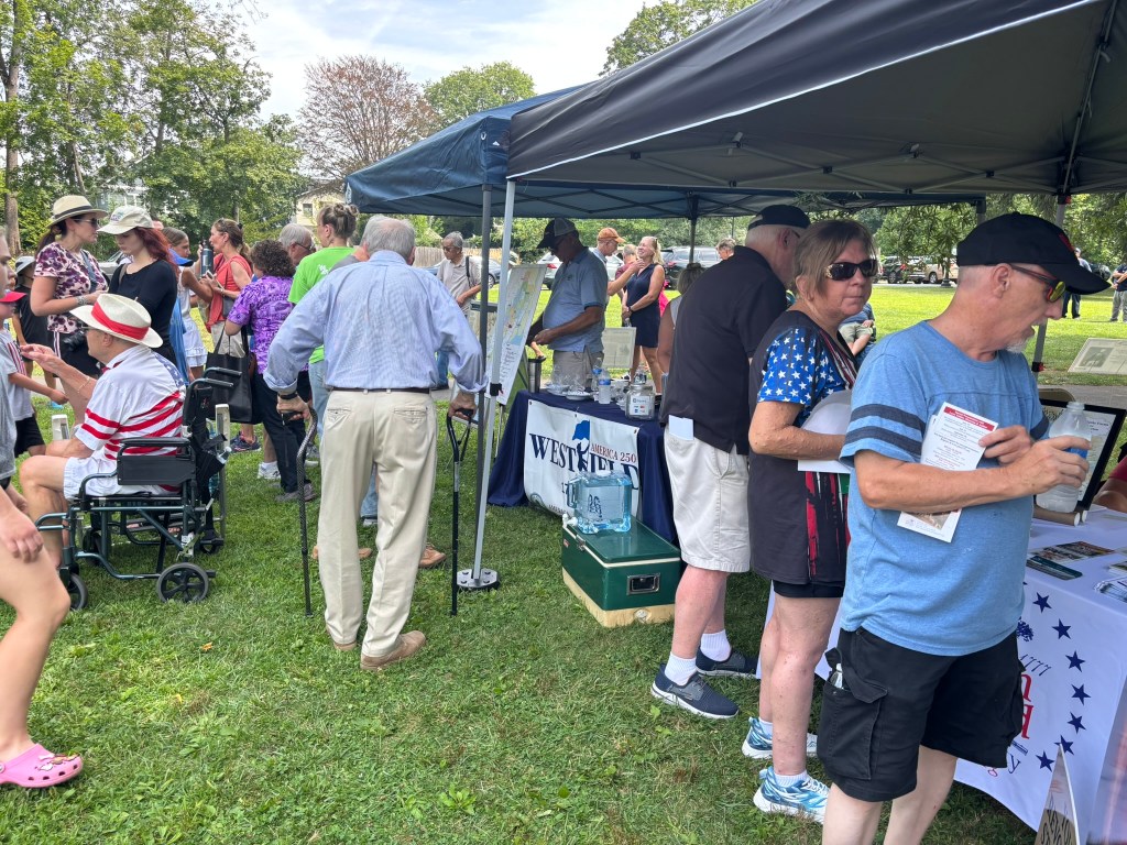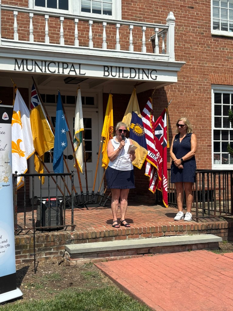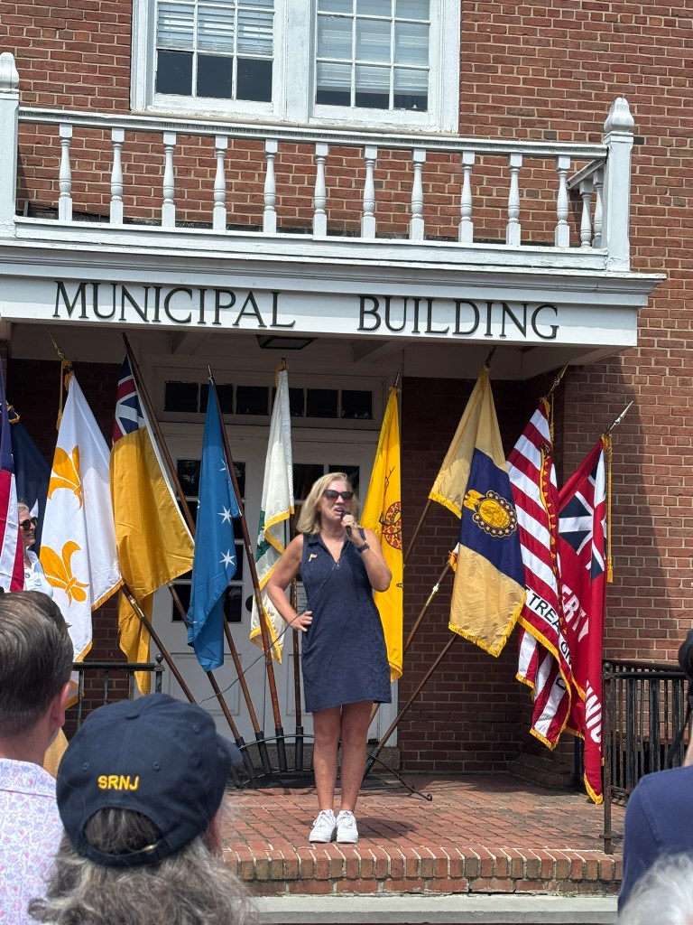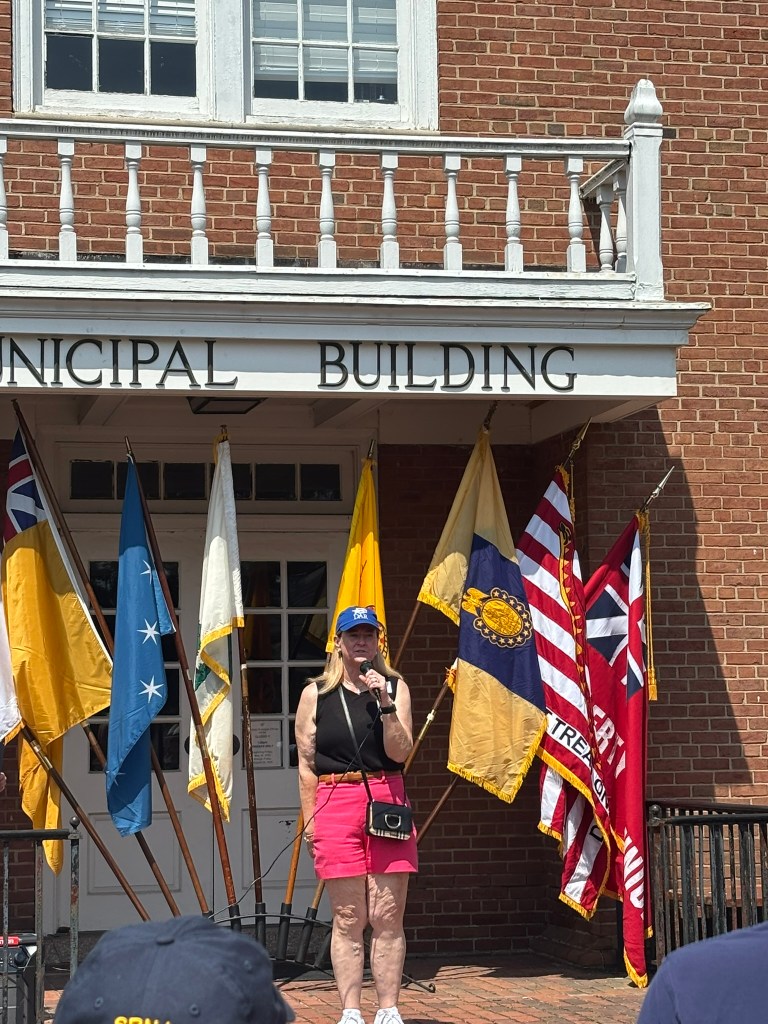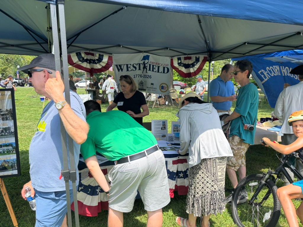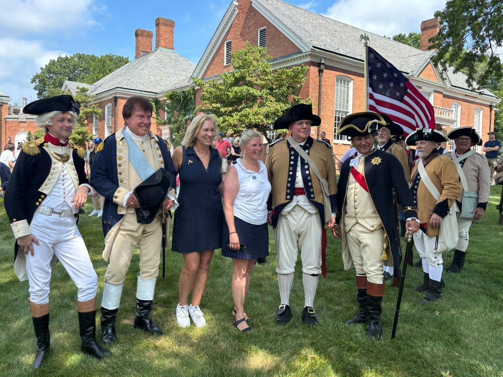 The program began at noon with an opening ceremony in front of Westfield Town Hall on East Broad Street. The first remarks, by Julie Diddel, chair of W3R-NJ, highlighted the significance of the Washington-Rochambeau Revolutionary Trail and Westfield’s role in the Revolution. She was followed by other speakers, including Westfield Mayor Shelley Brindle and leaders from local historical organizations. General George Washington, portrayed by reenactor Sam Davis, offered an opening prayer, and the New Jersey Fifes and Drums led the crowd in the Star-Spangled Banner.