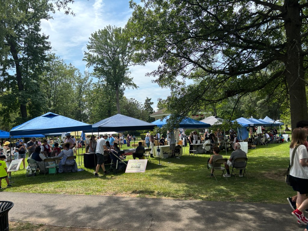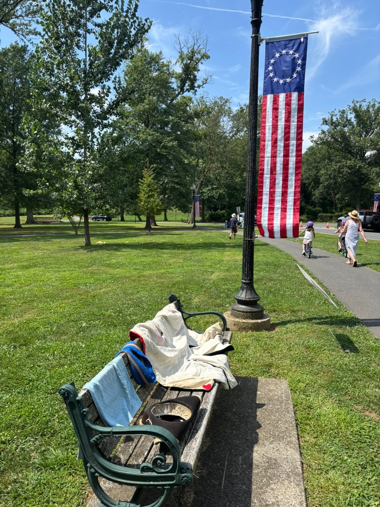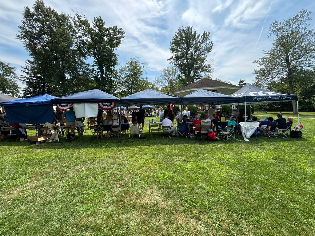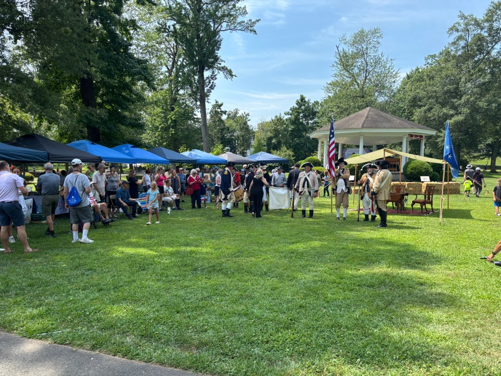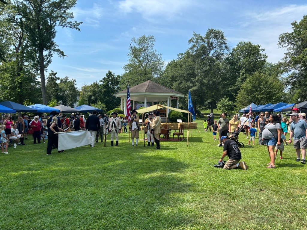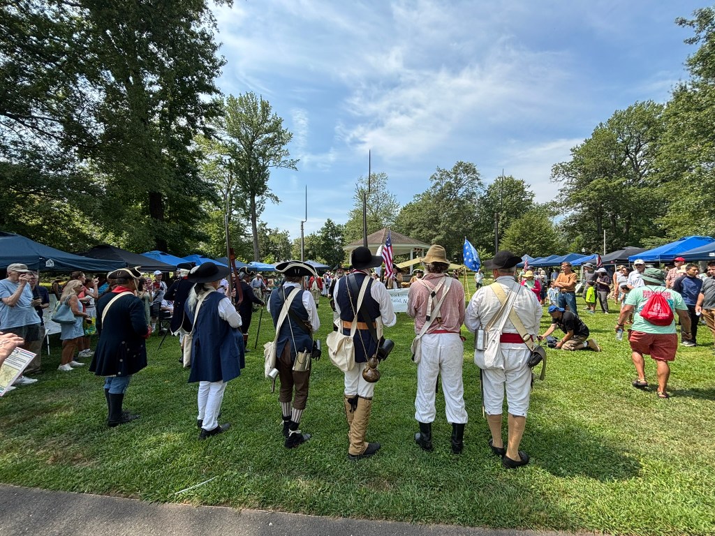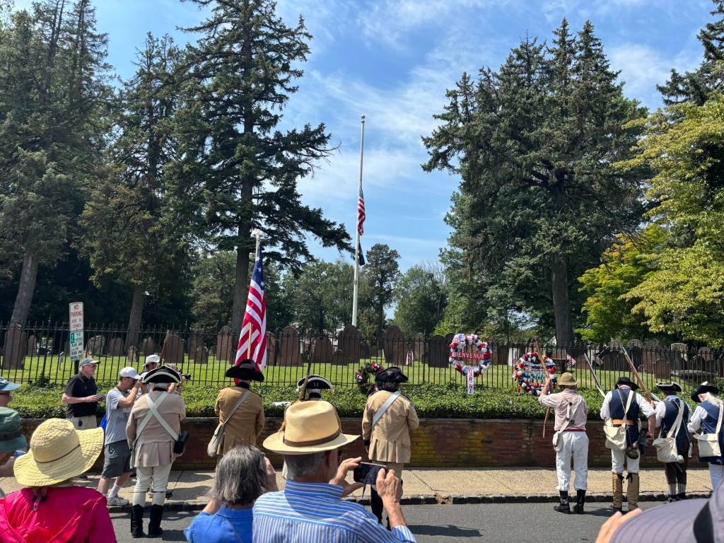 After the 20-minute opening ceremony, the crowd followed reenactors portraying George Washington, Comte de Rochambeau, and the Marquis de Lafayette—along with several Westfield officials—on a symbolic march down East Broad Street to Mountain Avenue. At the Presbyterian Church burial grounds, wreaths were placed in honor of the more than 70 Revolutionary War veterans, along with their families and other patriots, who are laid to rest there. From there, the procession continued into Mindowaskin Park. Joining the march were the New Jersey Sons of the American Revolution Color Guard, members of the Daughters of the American Revolution, the New Jersey Fifes and Drums, the Miller-Cory House Museum’s colonial living history interpreters, women camp followers, and the New Jersey Milita- Heard’s Brigade. Check out my Instagram and Facebook accounts for videos of the march.