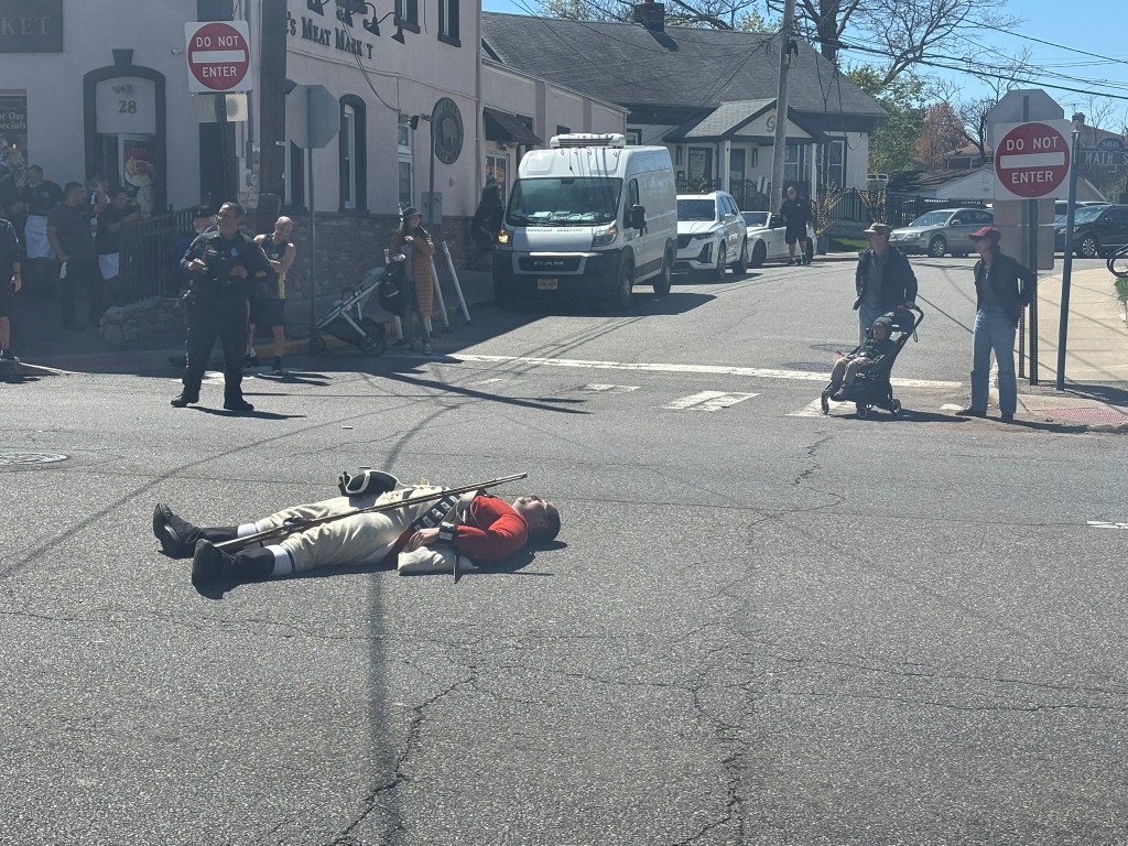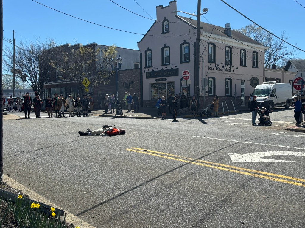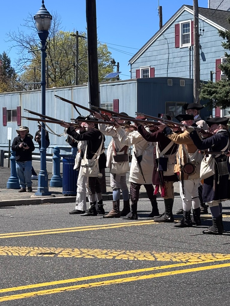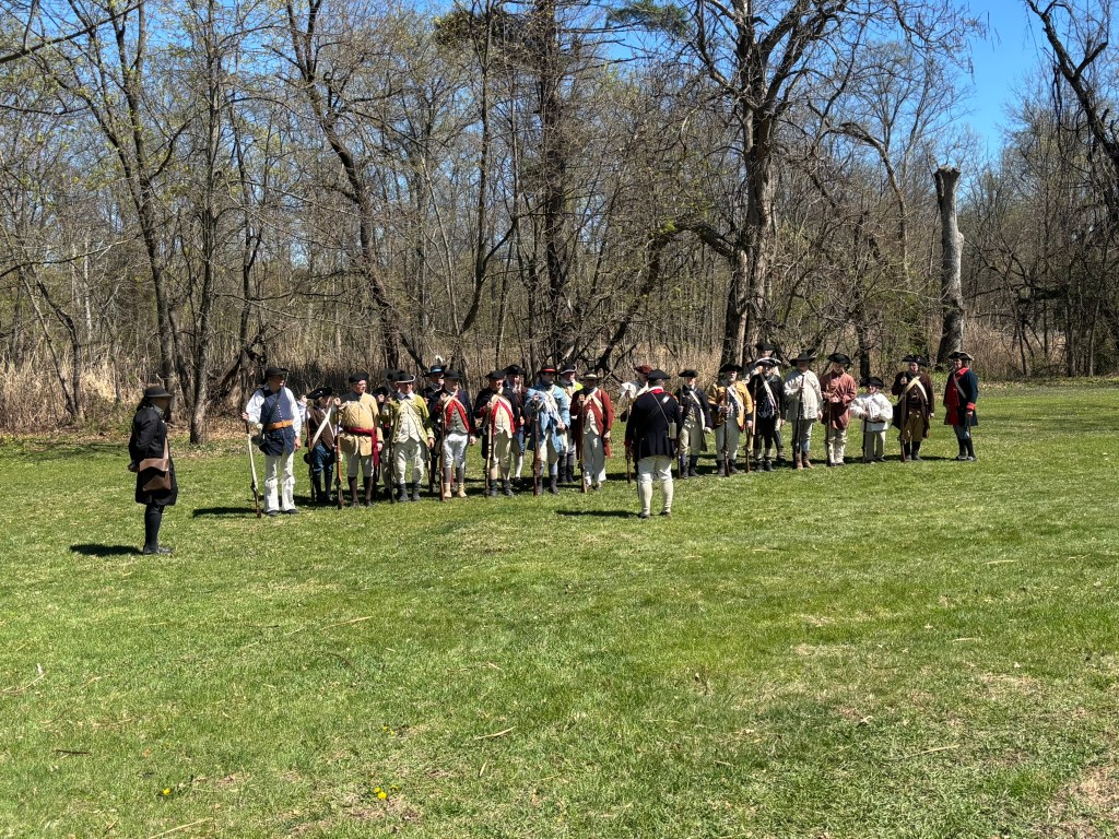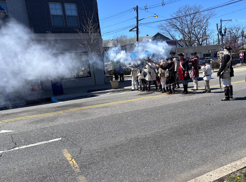 My family and I arrived along Main Street for the reenactment, and it was fascinating to watch from the sidewalk as both sides fired in the middle of the street. You really felt like you were right in the action. The battle moved down Main Street, back in the direction of the Staats House, and continued for about 30 minutes. The crowd followed along the sidewalk as the action progressed. Eventually, the troops returned to the Staats House, where they formed lines and continued firing their muskets.  The grounds of the Staats House became a revolutionary encampment.  While the battle was taking place, I recorded several videos, so be sure to check out my reels of the reenactment on Instagram and Facebook.