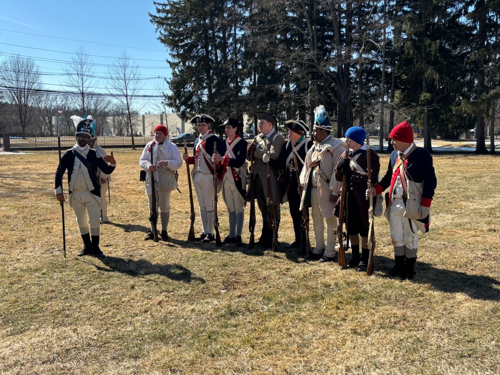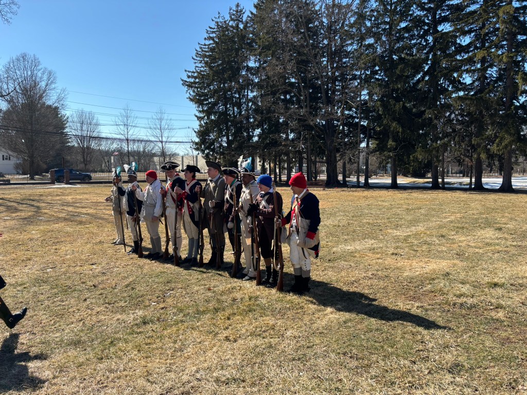 Next, we made our way to the front lawn and explored the dining tent. At 11:00 a.m., the 2nd New Jersey Regiment, Helm’s Company, performed military drills—including standing in formation, loading and firing muskets, marching, and executing a bayonet charge. It’s been a privilege to see Helm’s Company at several recent events, including the Battle of Monmouth Reenactment and Lafayette’s Visit to Morristown. After the demonstration, the reenactors answered questions from the audience and posed for photos.